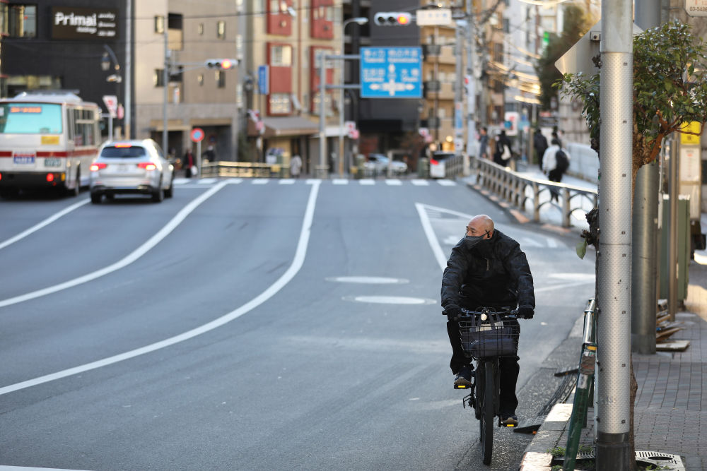 2020年12月31日,在日本东京,骑行者戴口罩出行。(新华社记者杜潇逸摄)