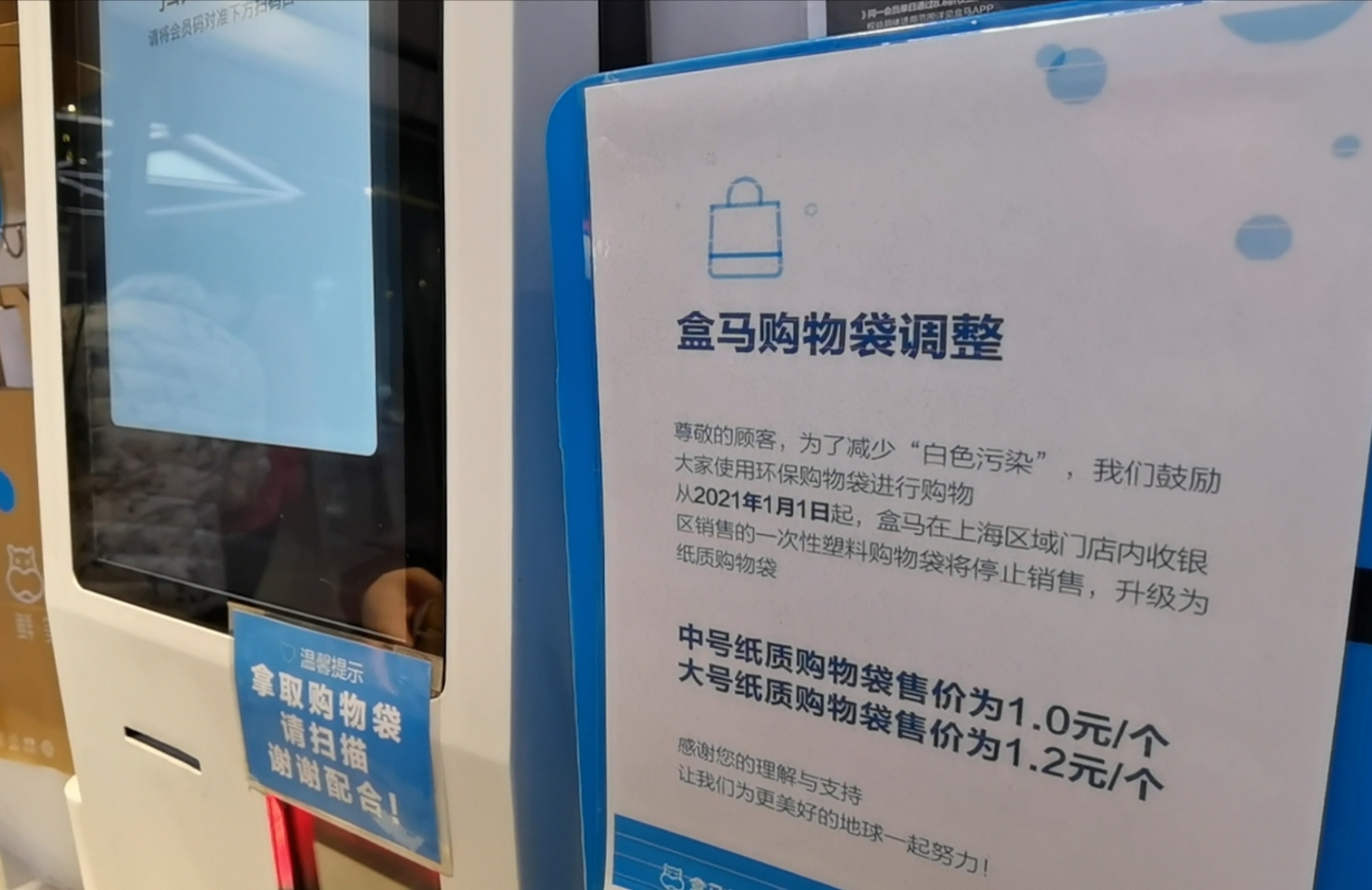 上海盒马鲜生门店自助结账区购物袋调整通知。新华社记者王默玲摄