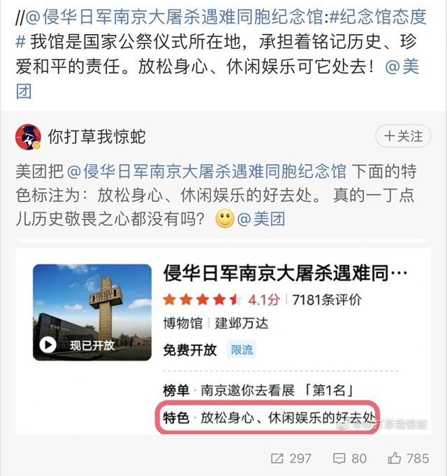 近日,有网友发现,在美团旗下某APP中,侵华日军南京大屠杀遇难同胞纪念馆的“特色”一栏中,竟被标注为“放松身心、休闲娱乐的好去处”。如此“说明”引发一片声讨,纪念馆官微也愤怒评论道,“我馆是国家公祭仪式所在地,承担着铭记历史、珍爱和平的责任。放松身心、休闲娱乐可它处去!@美团”