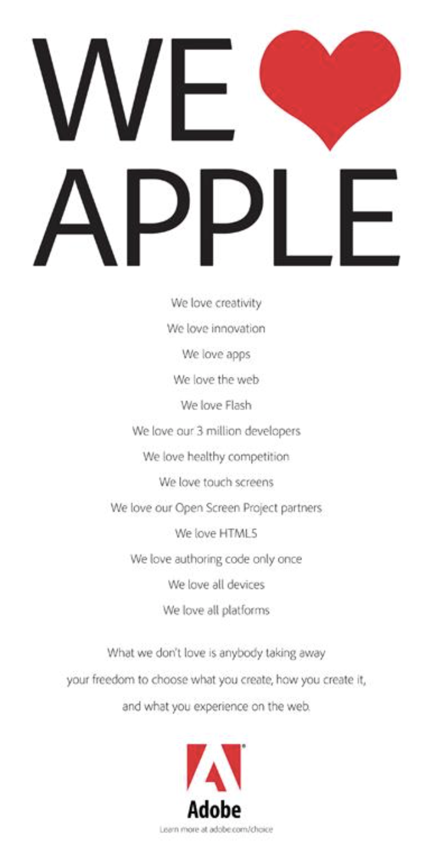 △当年Adobe用了“We Love Flash,We Love Apple”煽情的公关方式来应对,但是并没有什么用