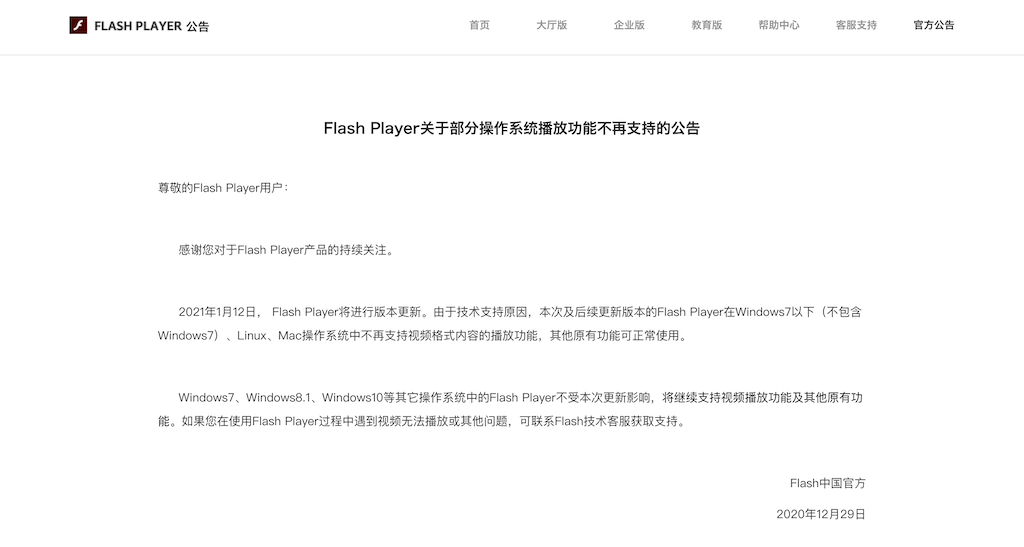 2020年,几乎所有互联网用户在打开电脑浏览器时都会看到这样一句话:“Flash Player 将于2020年12月31日停止支持”。