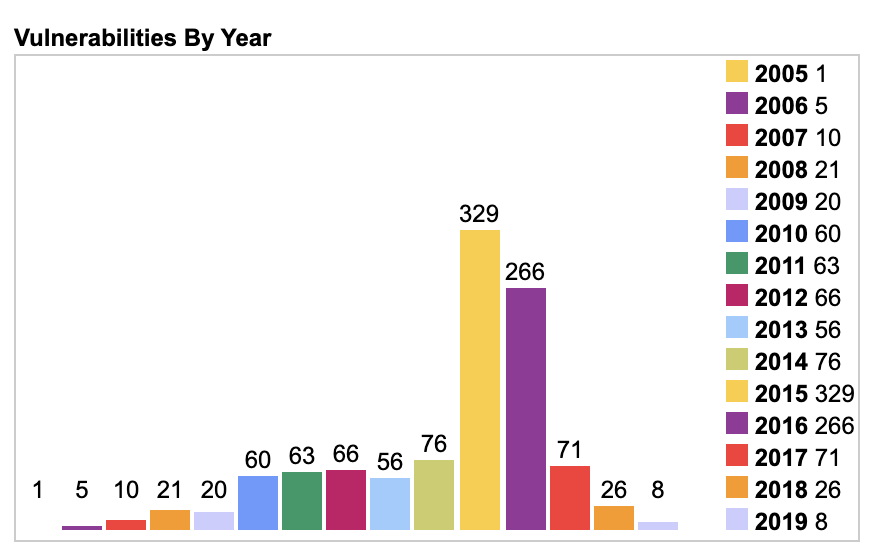 △2015、2016年几乎是Flash的高危年份。记录在案的总漏洞数为别为329个和266个(图片来自:CVE Details)