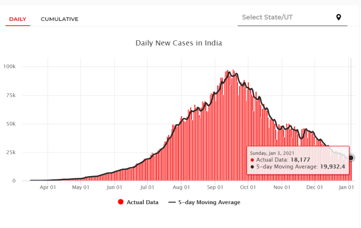 据印度卫生部当地时间3日早8时(北京时间10时30分)发布消息,印度24小时内新增新冠肺炎确诊病例18177例,累计确诊10323965例;新增死亡病例217例,累计死亡149435例;现存确诊病例减少2963例,降至247220例,累计治愈病例9927310例。据印度卫生部消息,印度新冠肺炎的总体治愈率为96.16%,死亡率为1.45%。