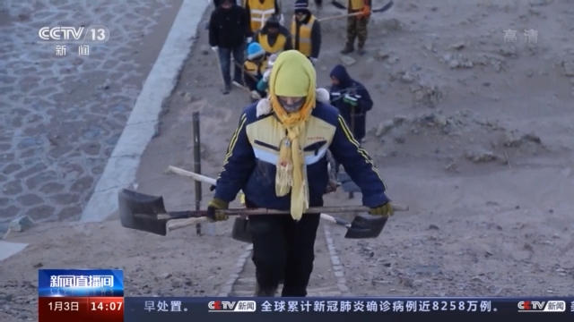 受冷空气影响加上一夜大风,天鹅湖西治沙点辖区内出现线路积沙,必须立即清理。天还没亮,20多名治沙工整理好工具前往沙害现场。上线清沙不到20分钟,他们的帽子、睫毛和口罩上都挂满了白霜。
