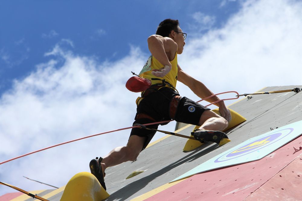 2020年9月26日,中攀联赛西藏林芝站,图为湖北攀岩国训队选手黄周文在男子难度攀岩赛决赛中。新华社记者王沁鸥摄