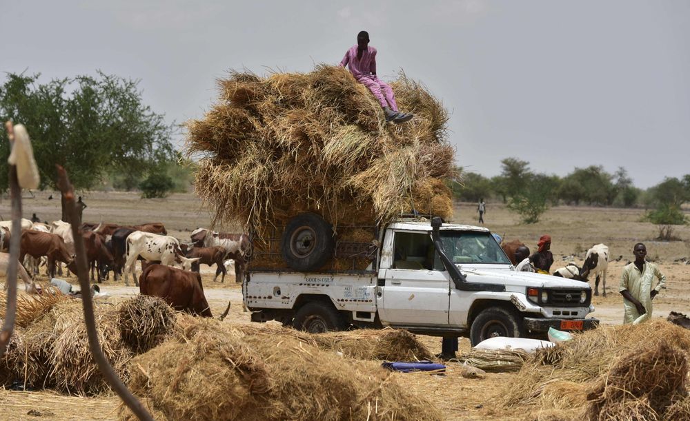 2016年6月17日,在尼日尔迪法省的恩贾贾姆村,村民坐在装着干草的车辆上。尼日尔军方当日说,恩贾贾姆村前一天遭极端组织“博科圣地”武装分子袭击,造成至少7名尼军士兵死亡、12名士兵受伤。(新华社/法新)