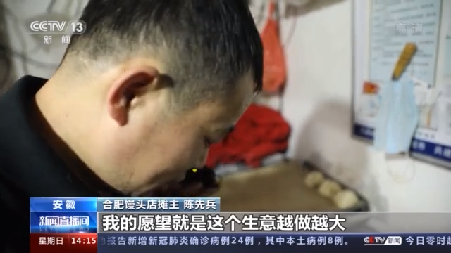 合肥馒头店摊主 陈先兵:我的愿望其实这个生意越做越大,超过今年的利润。 现在每天要卖六七千个馒头,下一步明年目标是每天能卖一万个。