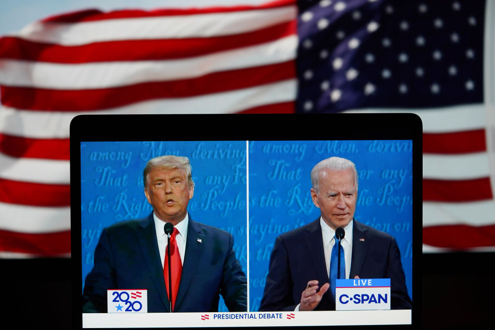 这张2020年10月22日在美国弗吉尼亚州阿灵顿拍摄的视频画面显示,美国总统特朗普(左)与民主党总统候选人拜登在田纳西州纳什维尔市参加最后一场总统候选人电视辩论。(新华社记者 刘杰 摄)