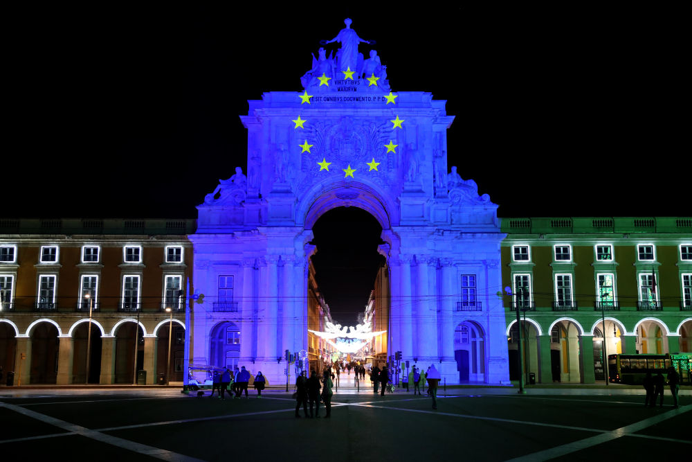 1月1日,葡萄牙里斯本的奥古斯塔街拱门上投影出欧盟旗帜的配色。