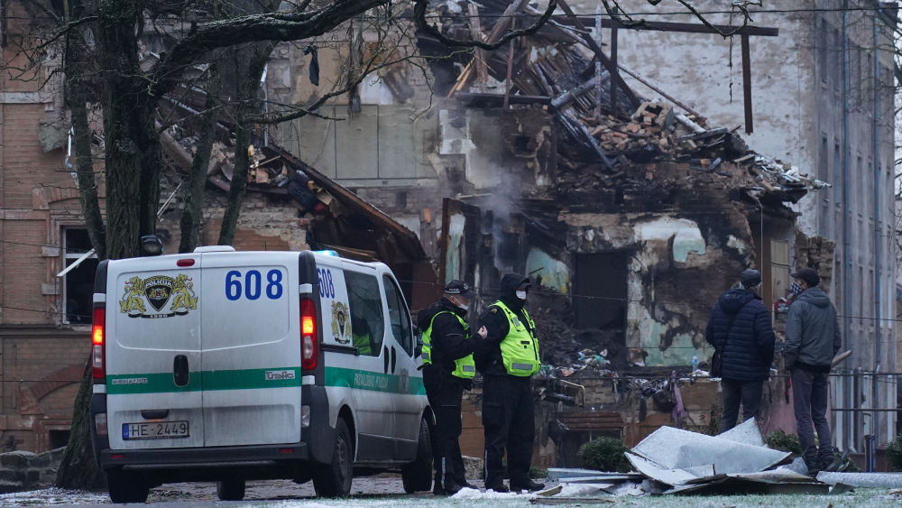2020年12月31日,在拉脱维亚首都里加,警察在爆炸后的居民楼外工作。