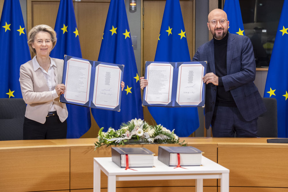 欧洲理事会主席米歇尔和欧盟委员会主席冯德莱恩当日代表欧盟,在布鲁塞尔签署了日前与英国就未来关系达成的协议。协议随后被送往英国,由英国首相约翰逊在伦敦签署。