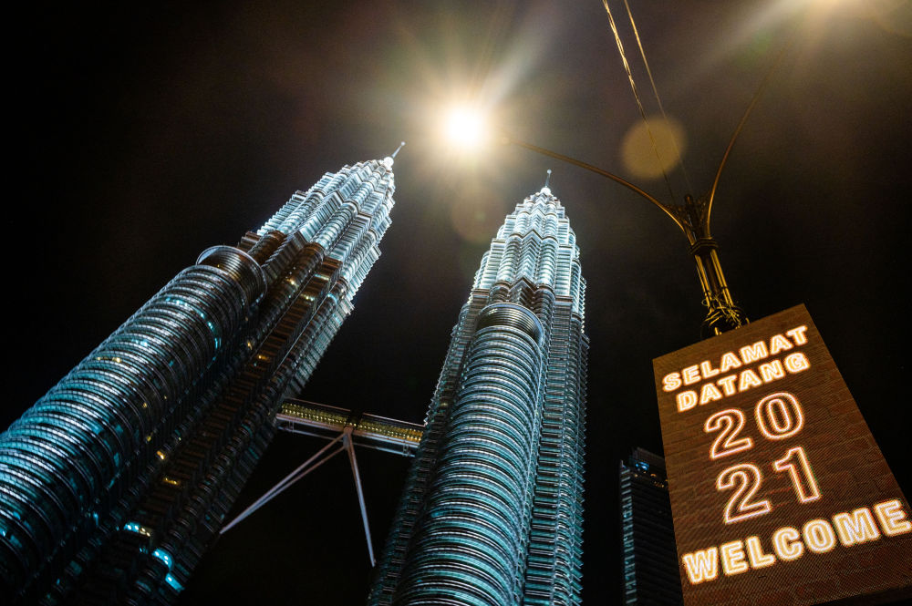 1月1日,在马来西亚吉隆坡马来西亚国家石油公司双塔附近,一块屏幕显示“欢迎2021”。