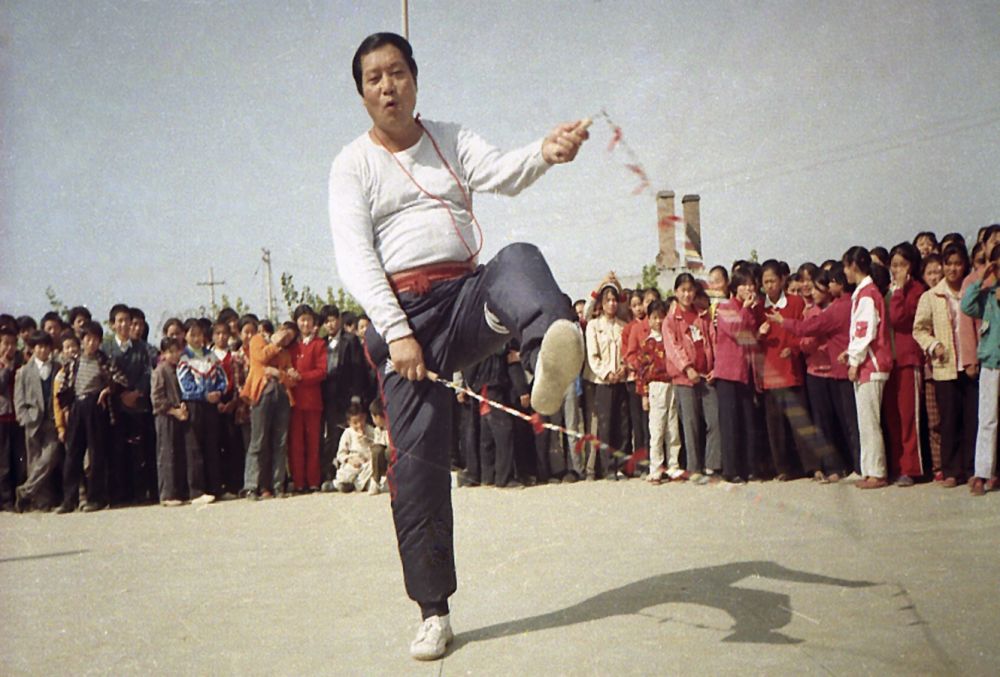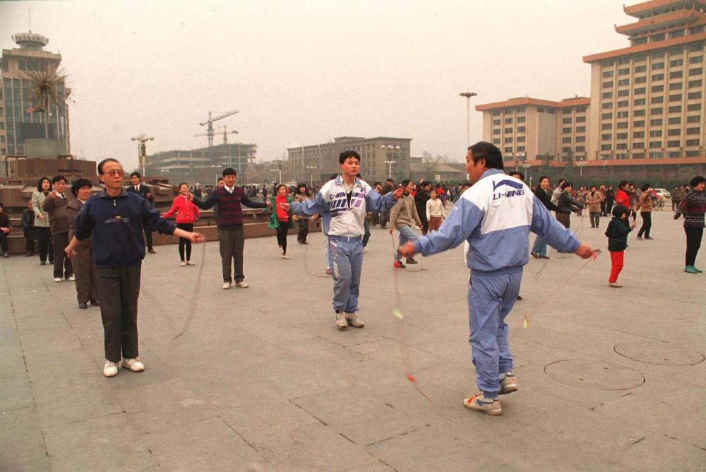 胡安民早年在西安市新城广场展示跳绳技艺。