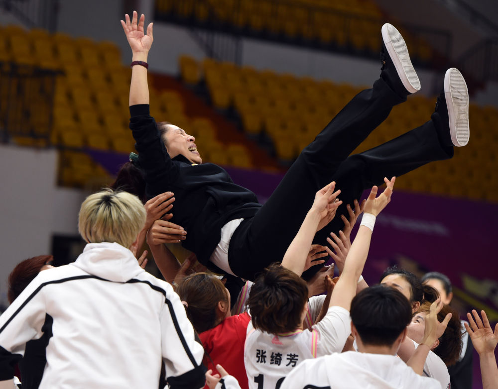 1月3日,内蒙古农信队成员将主教练郑薇(上)抛起庆祝夺冠。新华社记者 周牧 摄