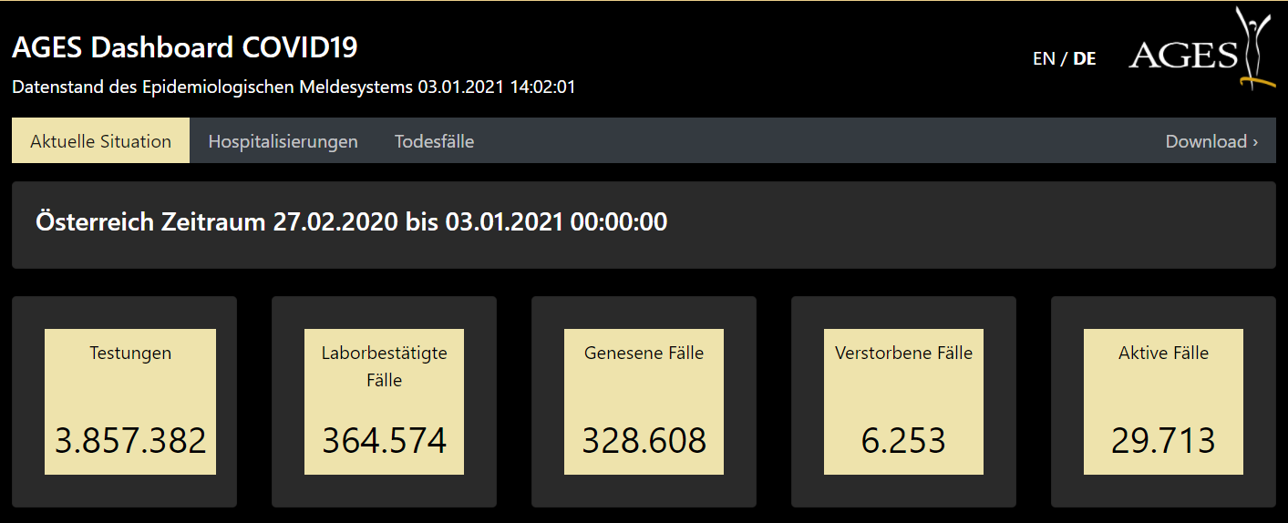 当地时间1月3日14时,奥地利卫生部数据显示,过去24小时该国新增新冠肺炎确诊病例1611例,累计确诊364574例;新增死亡病例39例,累计死亡6253例;累计治愈328608例。