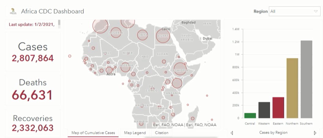 据非洲疾病预防控制中心数据,截止到非洲东部时间1月3日17时,非洲累计新冠肺炎确诊病例已达2807864例,累计死亡66631例,累计治愈2332063例。