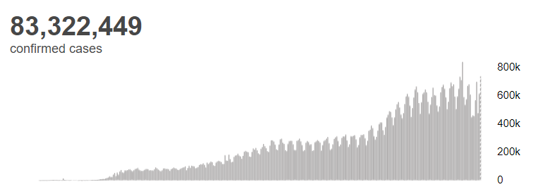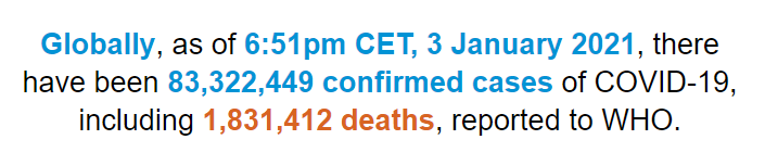 根据世卫组织最新实时统计数据,截至欧洲中部时间1月3日18时51分(北京时间1月4日1时51分),全球累计新冠肺炎确诊病例83322449例,累计死亡病例1831412例。3日全球新冠肺炎确诊病例新增740221例,死亡病例新增12502例。
