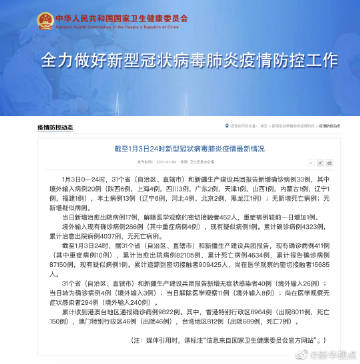 截至1月3日24时,据31个省(自治区、直辖市)和新疆生产建设兵团报告,现有确诊病例411例(其中重症病例10例),累计治愈出院病例82105例,累计死亡病例4634例,累计报告确诊病例87150例,现有疑似病例1例。累计追踪到密切接触者909425人,尚在医学观察的密切接触者15685人。