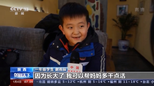 一年级学生 谢雨辰:(记者:你的新年愿望是什么?)快点长大。(记者:为什么要快点长大,不用凑这么近?)因为长大了,我可以帮妈妈多干点活,拖地、洗碗、做饭。