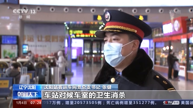 沈阳站客运车间党总支书记 张健:车站对候车室的卫生消杀也是加大了频次,我们还结合候车室的特点 加大了和加密了候车室通风卫生保洁的频次,确保候车室卫生保洁质量达标。