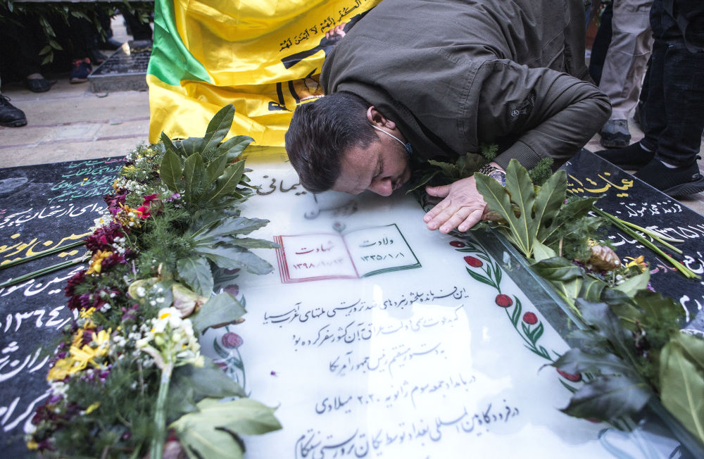 1月2日,在伊朗克尔曼,一名男子亲吻苏莱曼尼之墓。(新华社发,艾哈迈德·哈拉比萨斯摄)