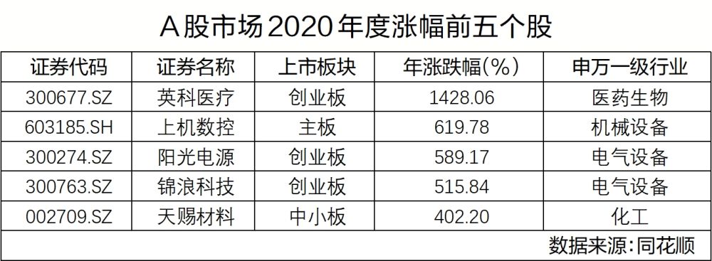 新华社北京1月4日电(记者罗逸姝)2020年A股圆满收官,全年市场总体表现良好,三大指数年内涨幅均在10%以上,创业板指领衔大涨65%,创近五年来新高,食品饮料、新能源、免税、光伏等多个行业表现突出。个股层面分化明显,“翻倍股”达270只,“百元股”阵容进一步扩容,与此同时,仅54%的个股实现年度上涨,307只个股全年跌超30%。