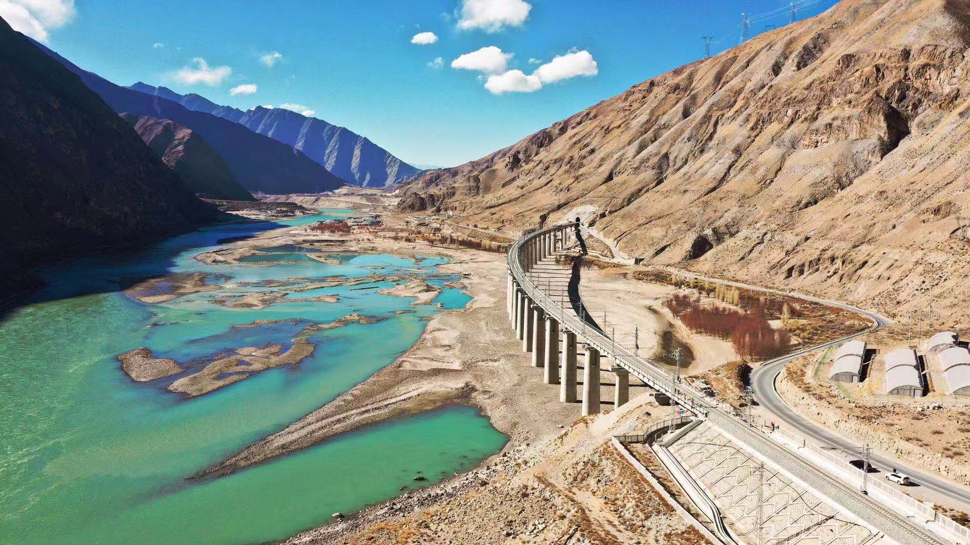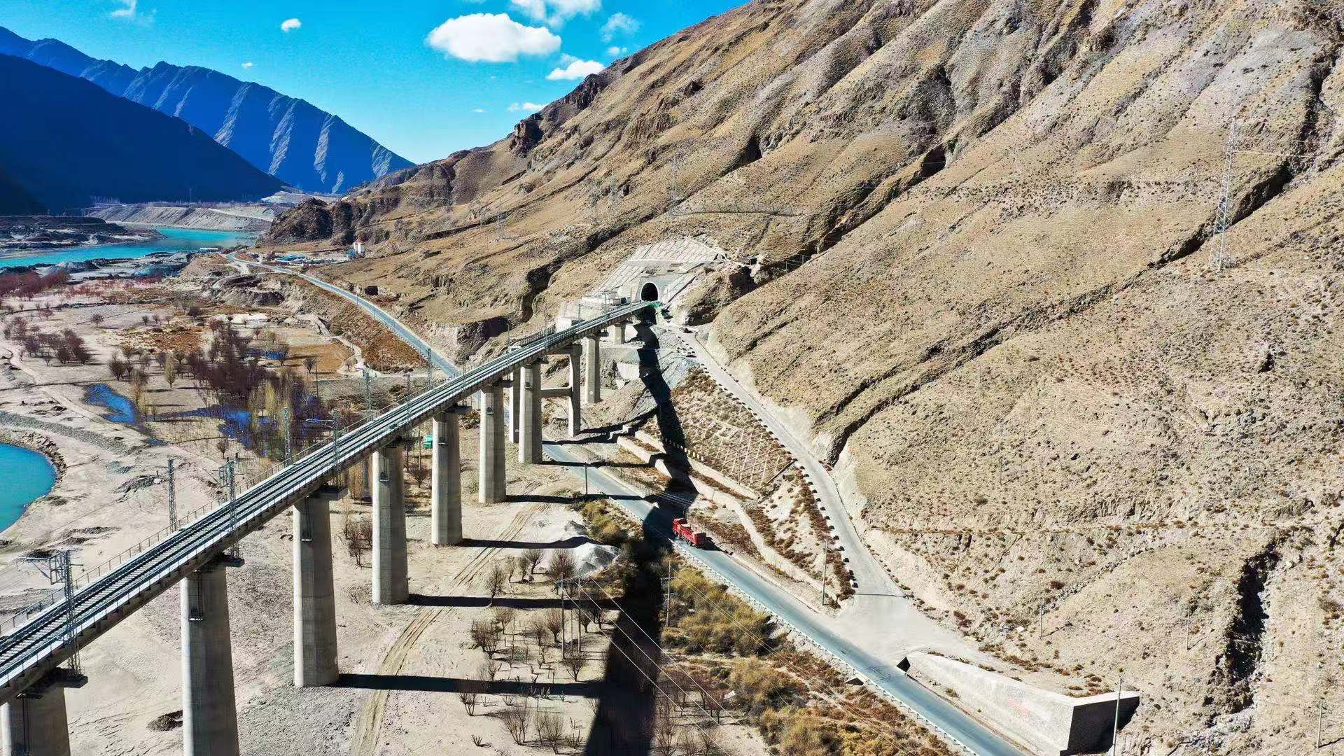 元旦期间,人民日报记者走访川藏铁路拉林段(下称拉林铁路),为您带来这项工程的最新美图。拉林铁路正线全长435.5公里,新建正线403.1公里,设计行车速度为160km/h。全线桥梁120座,全长84.5公里;隧道共47座,累计216.5公里;桥隧比为74.66%。全线新建车站34个,初期开站17个,全线建设总工期为7年。