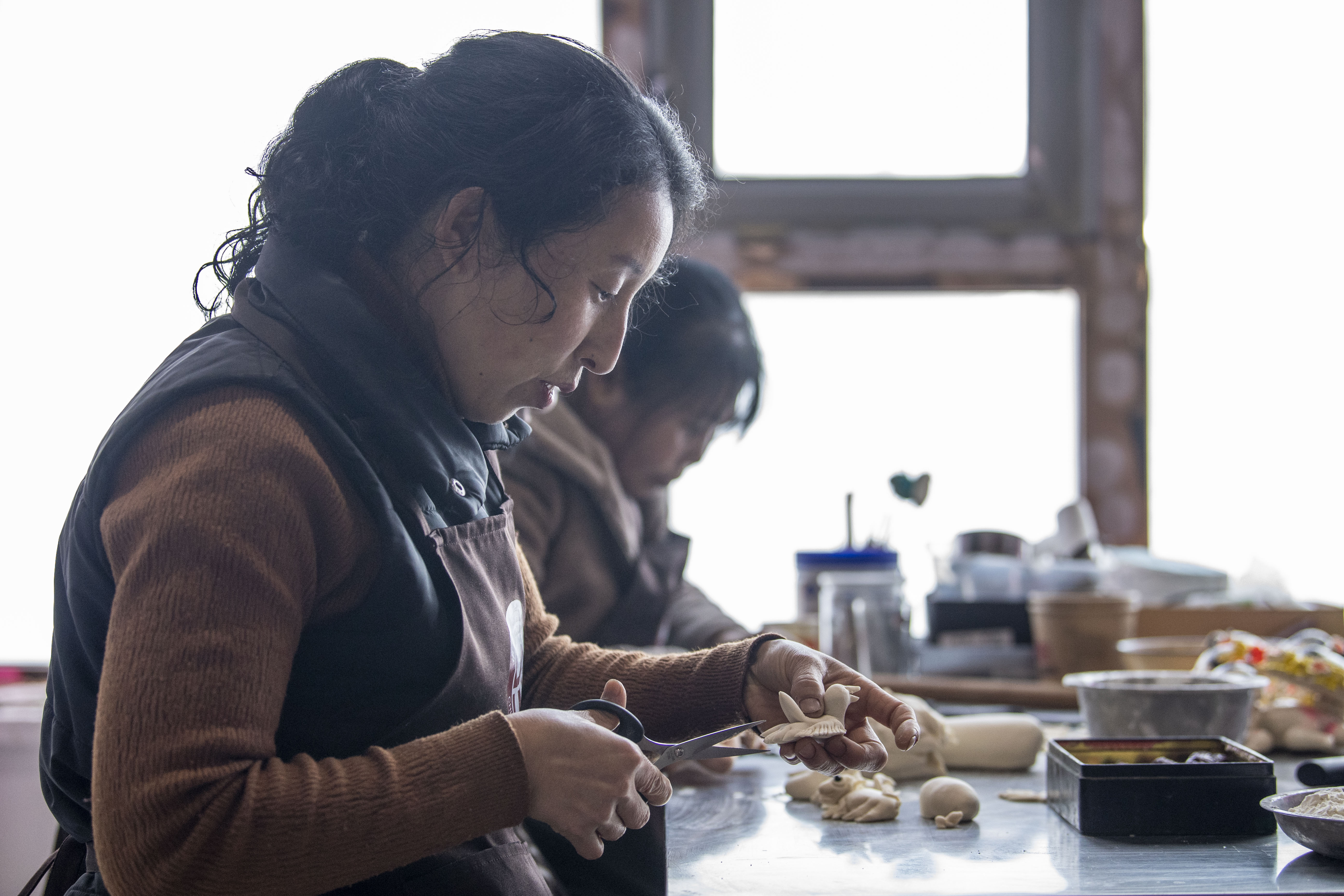 2020年12月30日,刘志平在位于岚县县城的面塑一条街学习制作面塑。