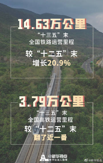 【数说#中国铁路的“十三五”#】2020年,中国铁路“十三五”圆满收官!来自中国国家铁路集团有限公司的最新统计显示,“十三五”期间,全国铁路营业里程由“十二五”末的12.10万公里增加到14.63万公里、增长20.9%,高铁由1.98万公里增加到3.79万公里、翻了近一番。“四纵四横”高铁网提前建成,“八纵八横”高铁网加密成型;国家铁路完成货物发送量157.8亿吨、较“十二五”增长1.7%,完成旅客发送量149亿人次,其中动车组发送90亿人次,较“十二五”分别增长41%、152%。高速、高原、高寒、重载铁路技术达到世界领先水平,复兴号高速列车迈出从追赶到领跑的关键一步。(记者樊曦、周圆)