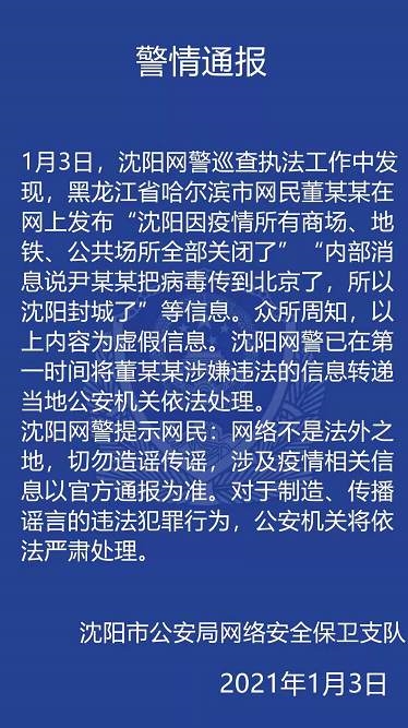 1月3日,针对哈尔滨一网民发布“沈阳封城”等虚假消息,沈阳市公安局网络安全保卫支队发布警情通报,全文如下: