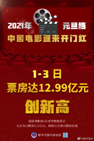【权威快报 | #2021年元旦档票房创新高#中国电影迎来开门红】国家电影局4日发布数据,2021年1月1日至3日(元旦档)全国电影票房达12.99亿元,打破了2018年创造的12.71亿元档期票房历史纪录,其中元旦当日票房6.01亿元,同比增长107.12%,刷新2018年创造的3.68亿元元旦单日票房纪录。(记者:白瀛、王鹏 海报设计:张晨光)