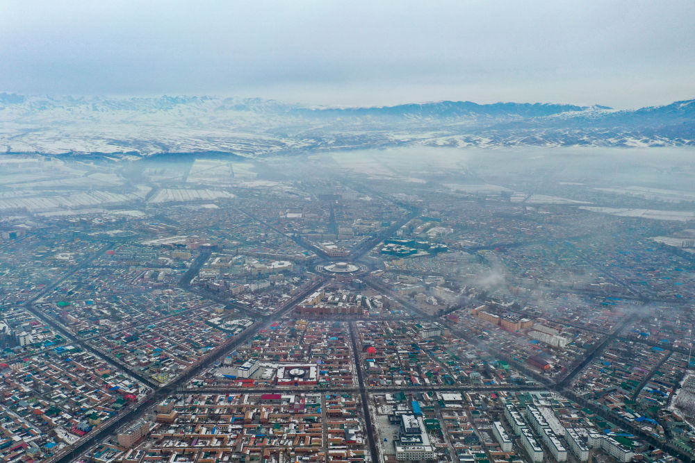 ↑这是冬日的新疆伊犁哈萨克自治州特克斯县“八卦城”(2021年1月2日摄,无人机照片)。