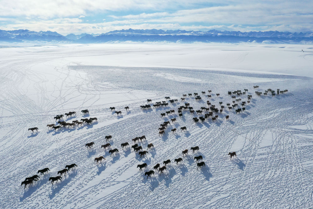↑这是在新疆伊犁哈萨克自治州昭苏县天马旅游文化园拍摄的奔驰的马群(2020年12月20日摄,无人机照片)。