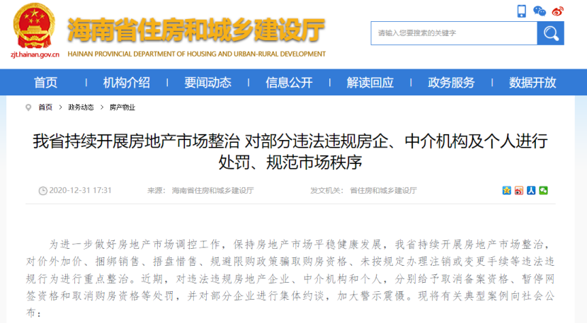 日前,海南省住建厅官网披露,海南省对价外加价、捆绑销售、捂盘惜售、规避限购政策骗取购房资格、未按规定办理注销或变更手续等违法违规行为进行重点整治。