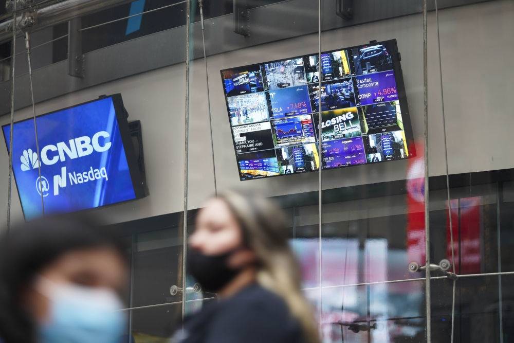 2020年9月3日,人们从美国纽约纳斯达克证券交易所的显示屏旁走过。(新华社记者王迎摄)