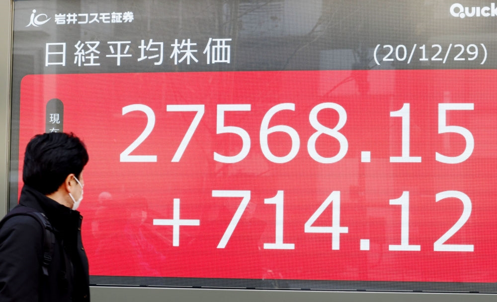 2020年12月29日,行人经过日本东京一处电子股指显示屏。(新华社/共同社)