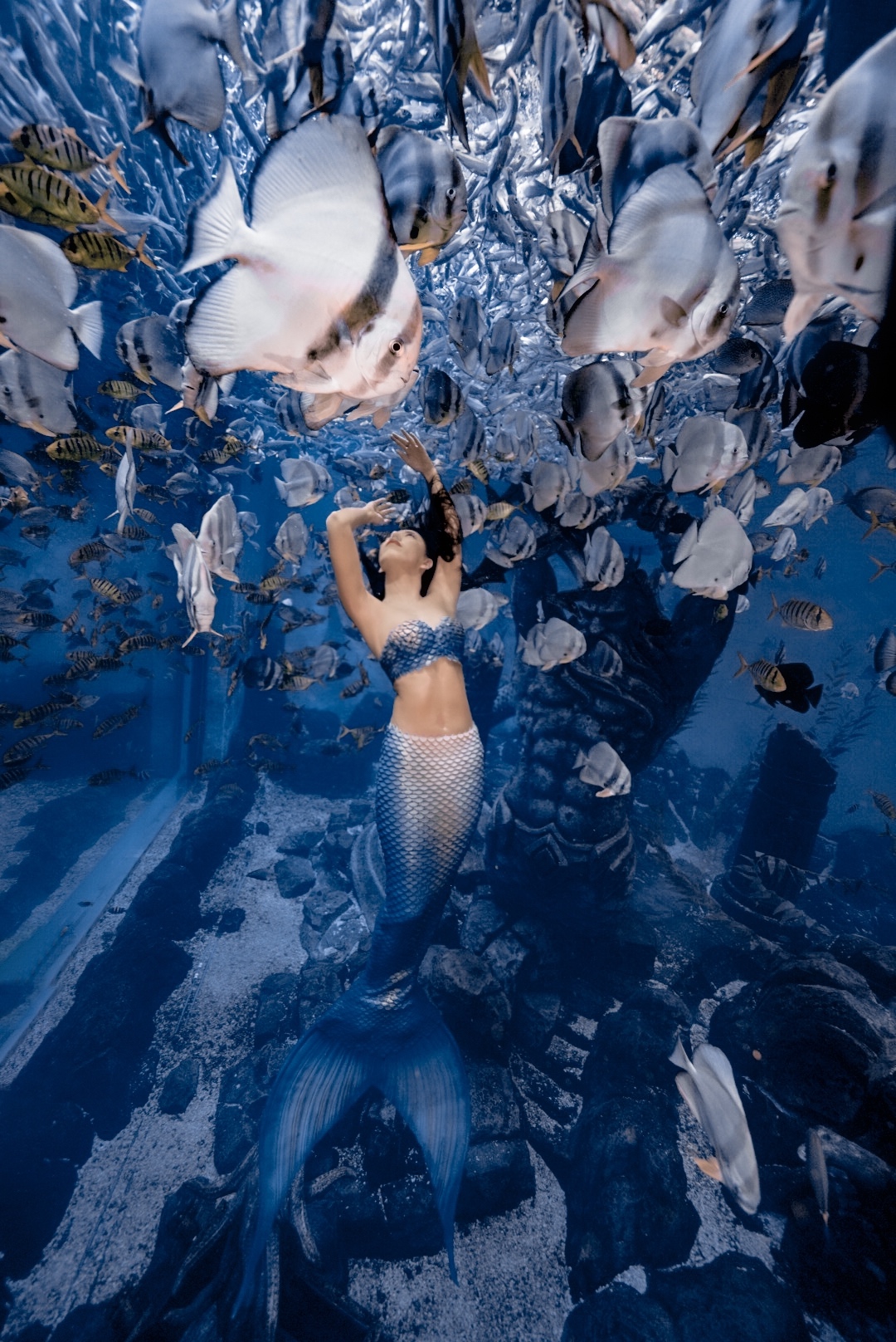 在蔚蓝色的“海水”中摆动鱼尾,尽情在水里穿梭,跟“海底”五彩斑斓的各种鱼类共舞,这是“美人鱼”表演从业者刘兰每天的工作。