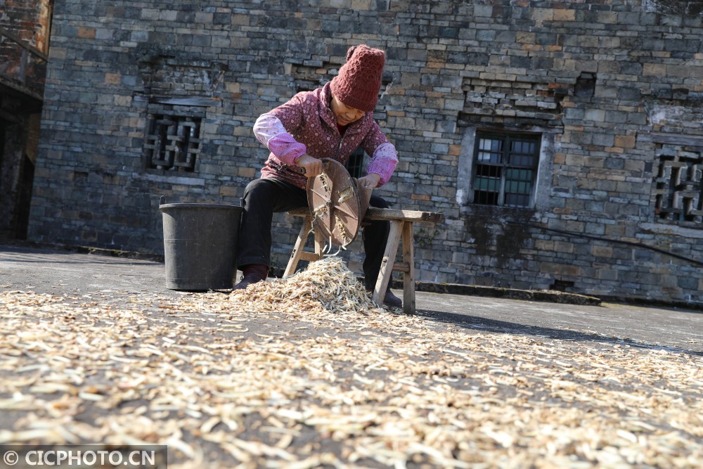 ↑2021年1月2日,湖南省永州市宁远县禾亭镇小桃源村村民在屋顶平台切红薯丝。CICPHOTO/何红福 摄