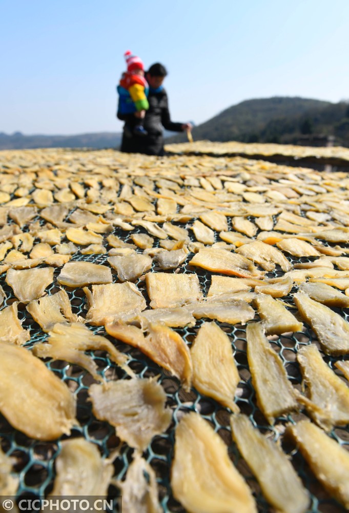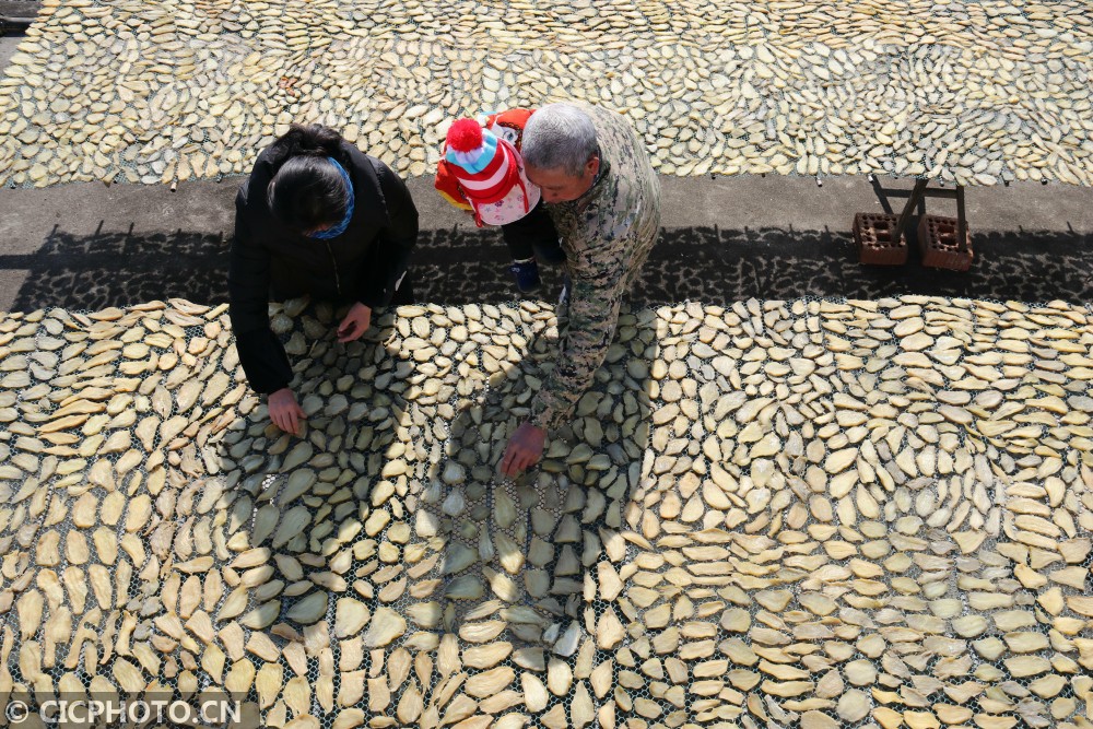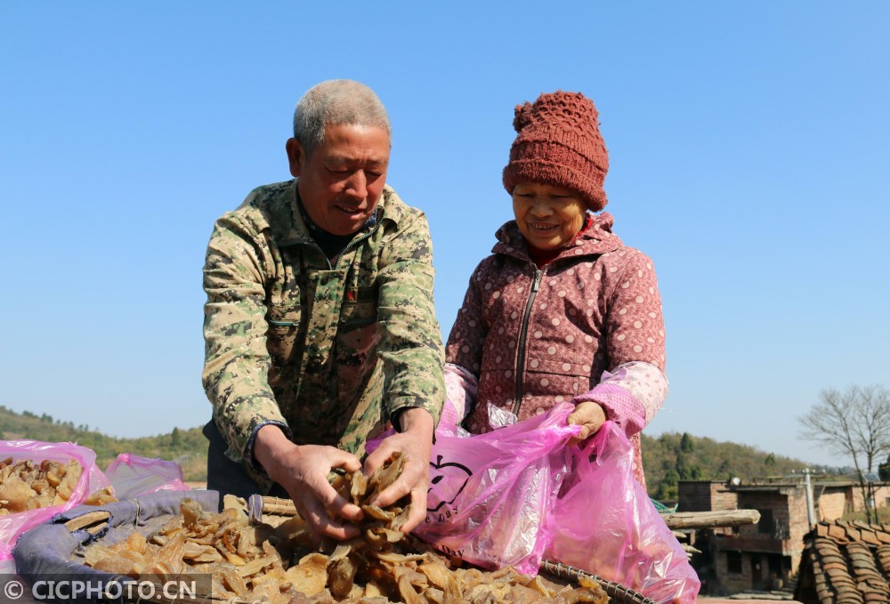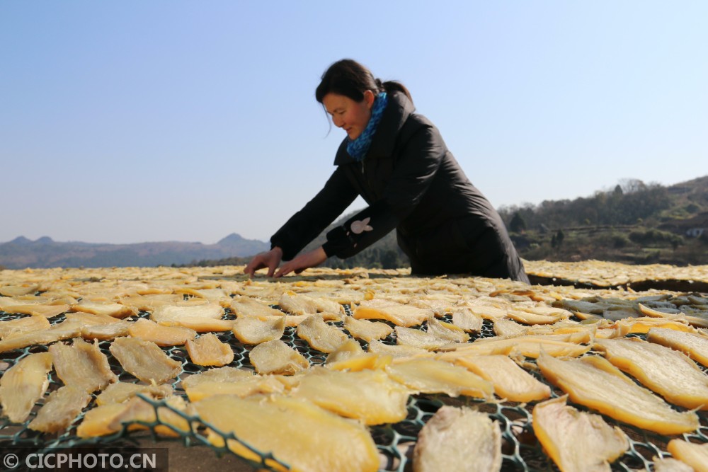 ↑2021年1月2日,湖南省永州市宁远县禾亭镇小桃源村村民在屋顶平台将晒好的红薯干装袋。CICPHOTO/周凤连 摄