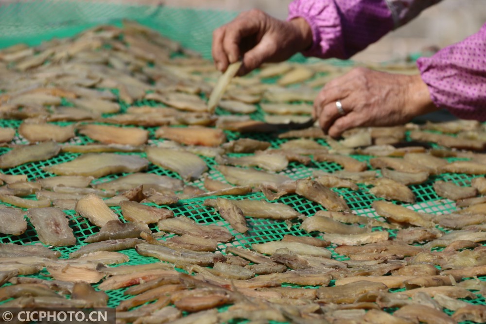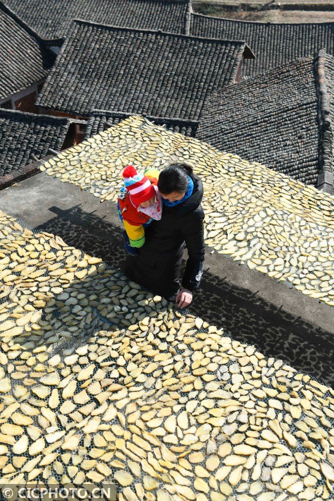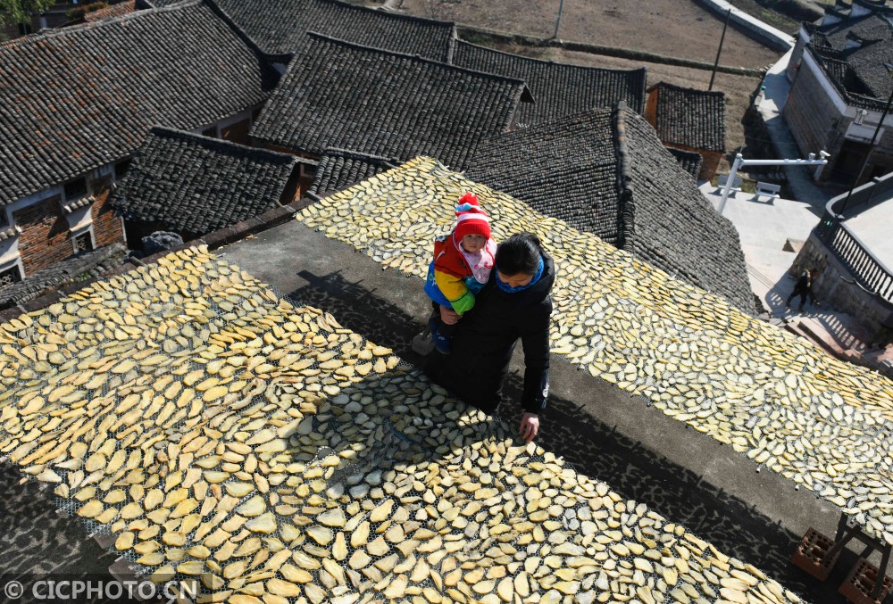 ↑2021年1月2日,湖南省永州市宁远县禾亭镇小桃源村村民在屋顶平台晒红薯干。CICPHOTO/周凤连 摄