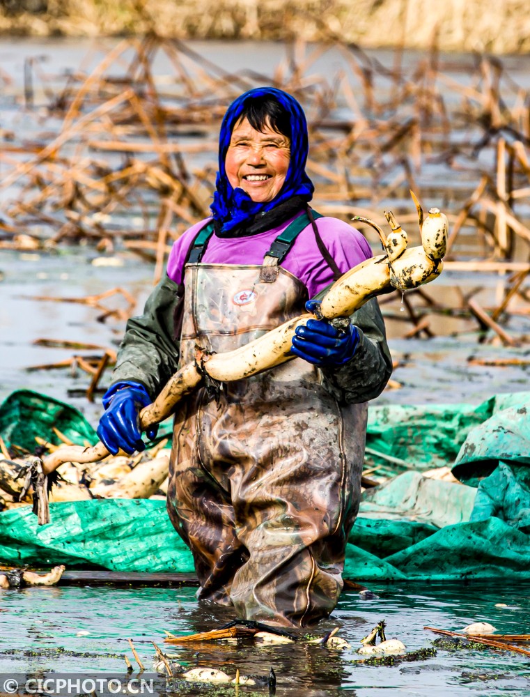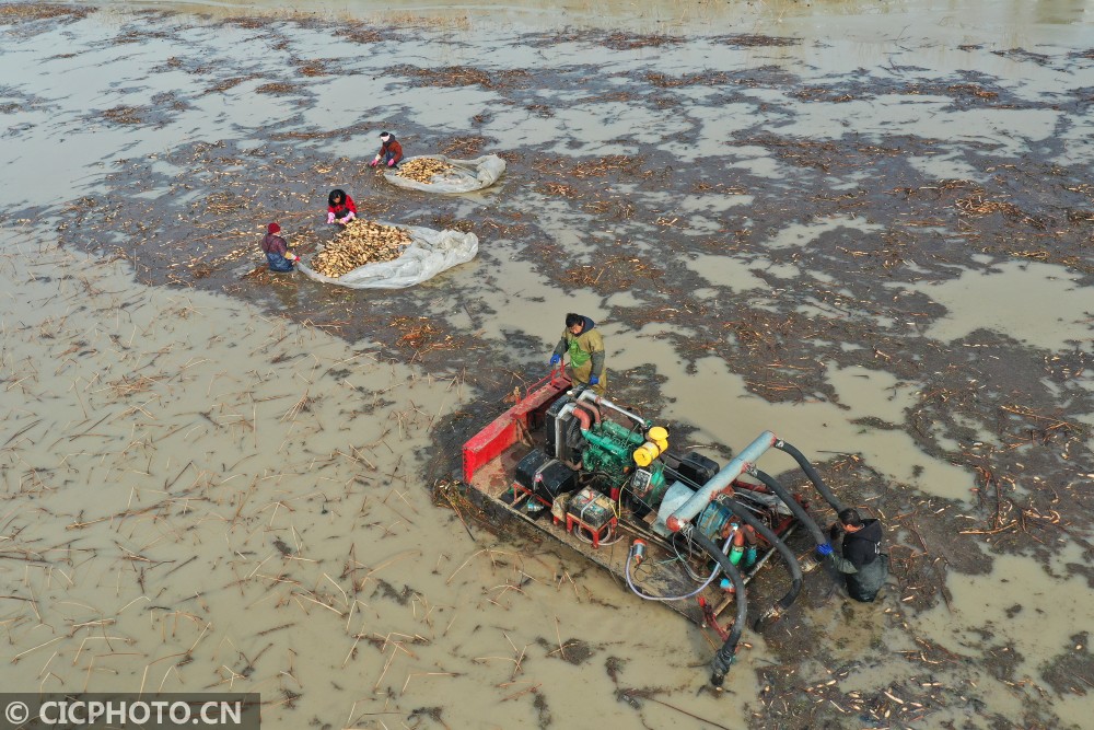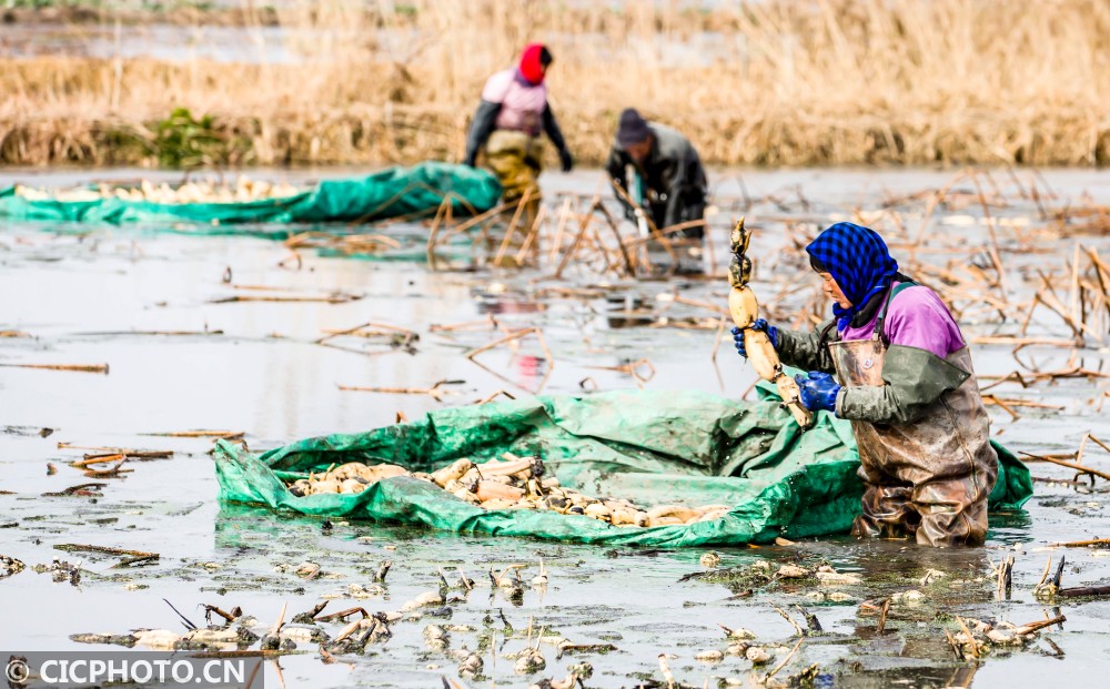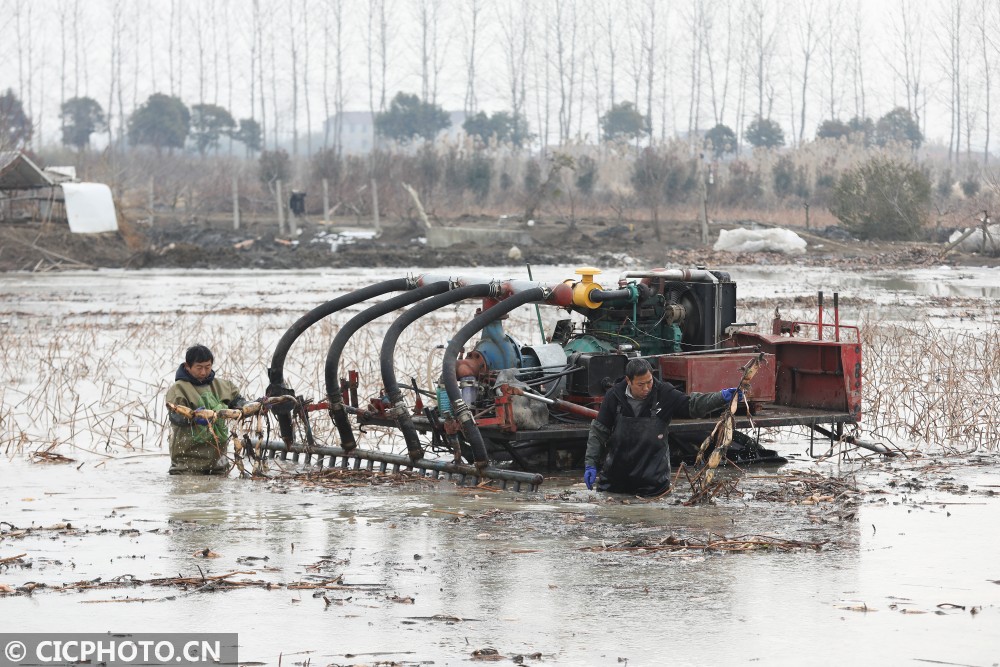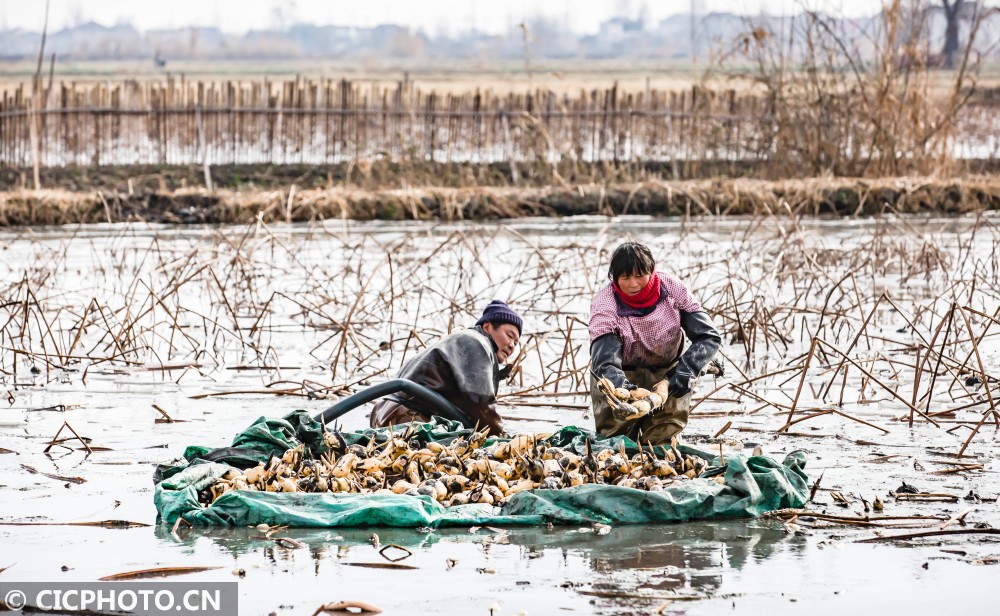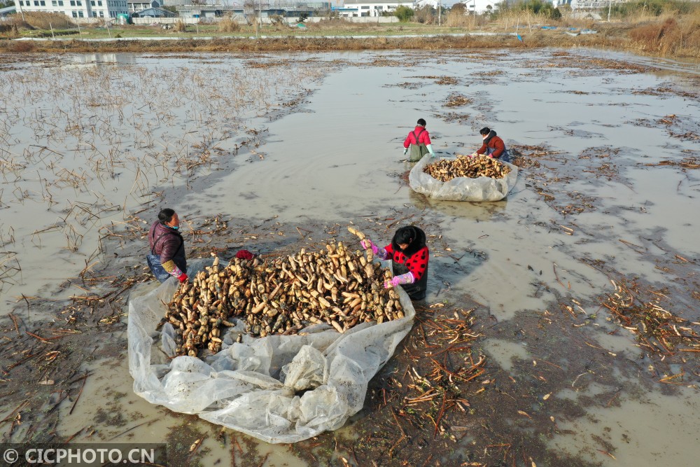 ↑2021年1月3日,江苏省海安市墩头镇新舍村,藕农在采收浅水藕。CICPHOTO/向中林 摄