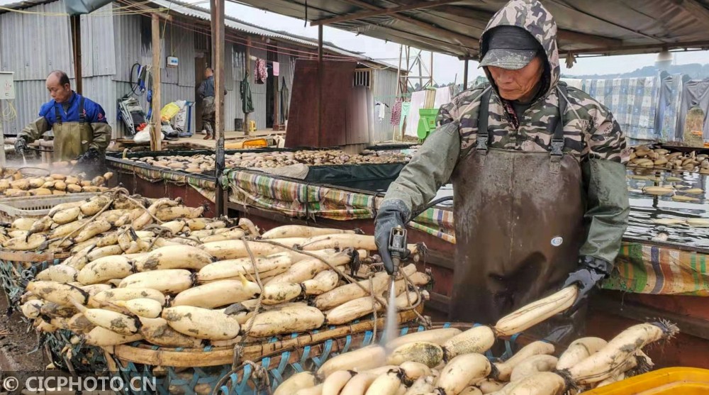 ↑2021年1月3日,湖南省衡阳市常宁市板桥镇板桥村,藕农在清洗刚采收的莲藕。CICPHOTO/唐雍钧 摄