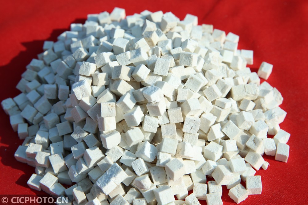 ↑2020年12月30日,湖南省怀化市靖州苗族侗族自治县茯苓贸易加工中心,一家茯苓加工企业加工的茯苓丁。CICPHOTO/刘杰华 摄
