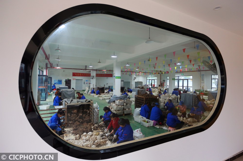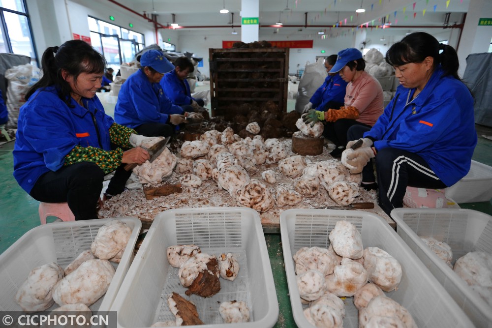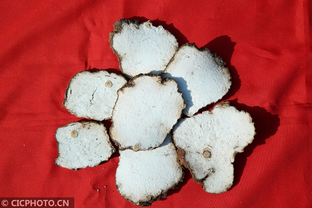 ↑2020年12月30日,湖南省怀化市靖州苗族侗族自治县茯苓贸易加工中心,一家茯苓加工企业加工的茯苓片。CICPHOTO/刘杰华 摄