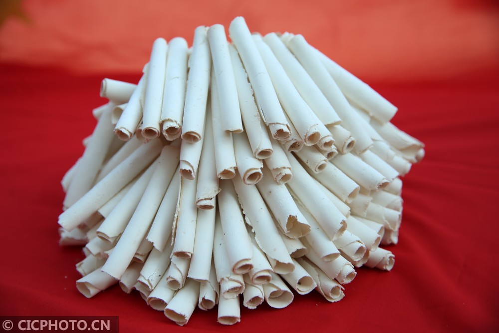 ↑2020年12月30日,湖南省怀化市靖州苗族侗族自治县茯苓贸易加工中心,一家茯苓加工企业加工的茯苓卷。CICPHOTO/刘杰华 摄