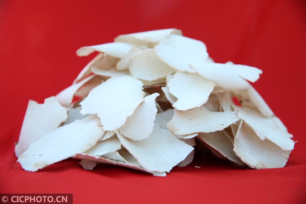 ↑2020年12月30日,湖南省怀化市靖州苗族侗族自治县茯苓贸易加工中心,一家茯苓加工企业加工的茯神片。CICPHOTO/刘杰华 摄