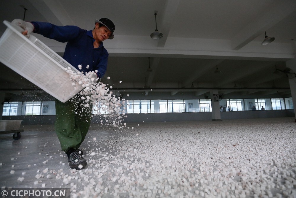 ↑2020年12月30日,湖南省怀化市靖州苗族侗族自治县茯苓贸易加工中心,一家茯苓加工企业的工人在晾烘加工成型的茯苓丁。CICPHOTO/刘杰华 摄