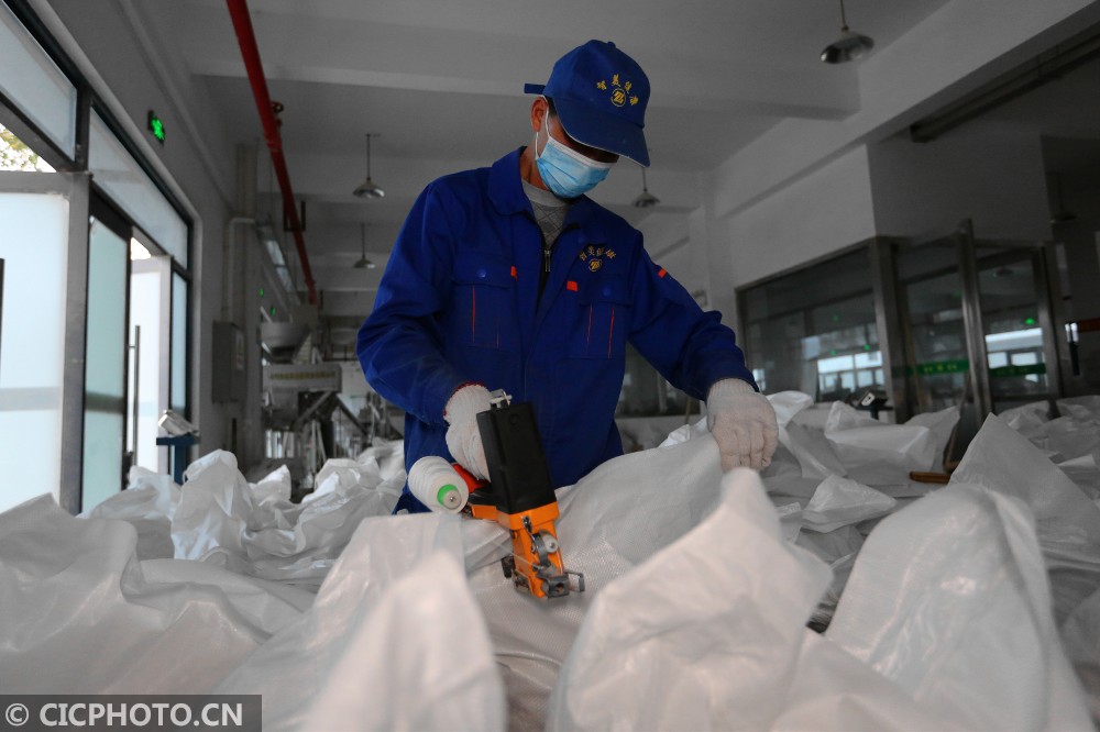 ↑2020年12月30日,湖南省怀化市靖州苗族侗族自治县茯苓贸易加工中心,一家茯苓加工企业的工人在封装加工好的茯苓产品,准备发货。CICPHOTO/刘杰华 摄