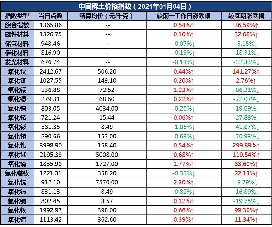 新华财经北京1月4日电(刘星麟)4日,中国稀土价格指数报1365.86点,较前一工作日上涨7.32点,涨幅为0.54%。氧化铽价格上涨,上游厂商挺价惜售,个别中间商少量变现出货,市场整体流通量有限,下游企业按需采购。