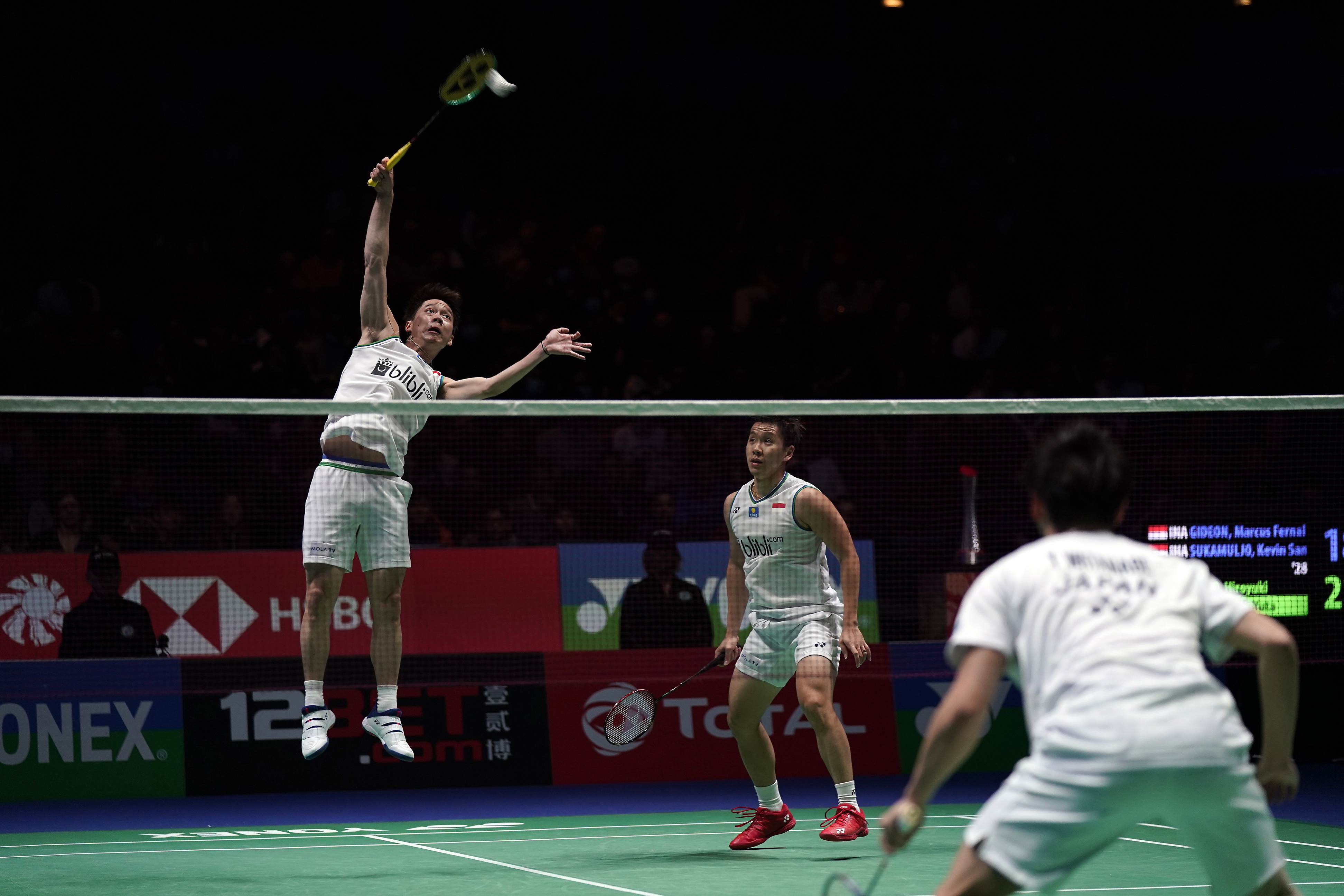 2020年3月15日,印度尼西亚选手吉迪恩(右)/苏卡穆约在比赛中回球。新华社/欧新
